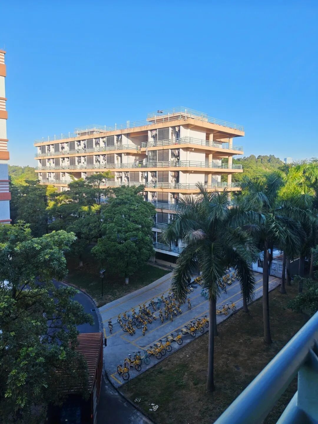 在实验室通宵奋斗后,回来已经8点钟了,回去路上经过3楼的连廊,正好看到日出时分的一幕,太阳照亮了宿舍楼的主体,而其他部分还在阴影中稍带着水汽与凉意。