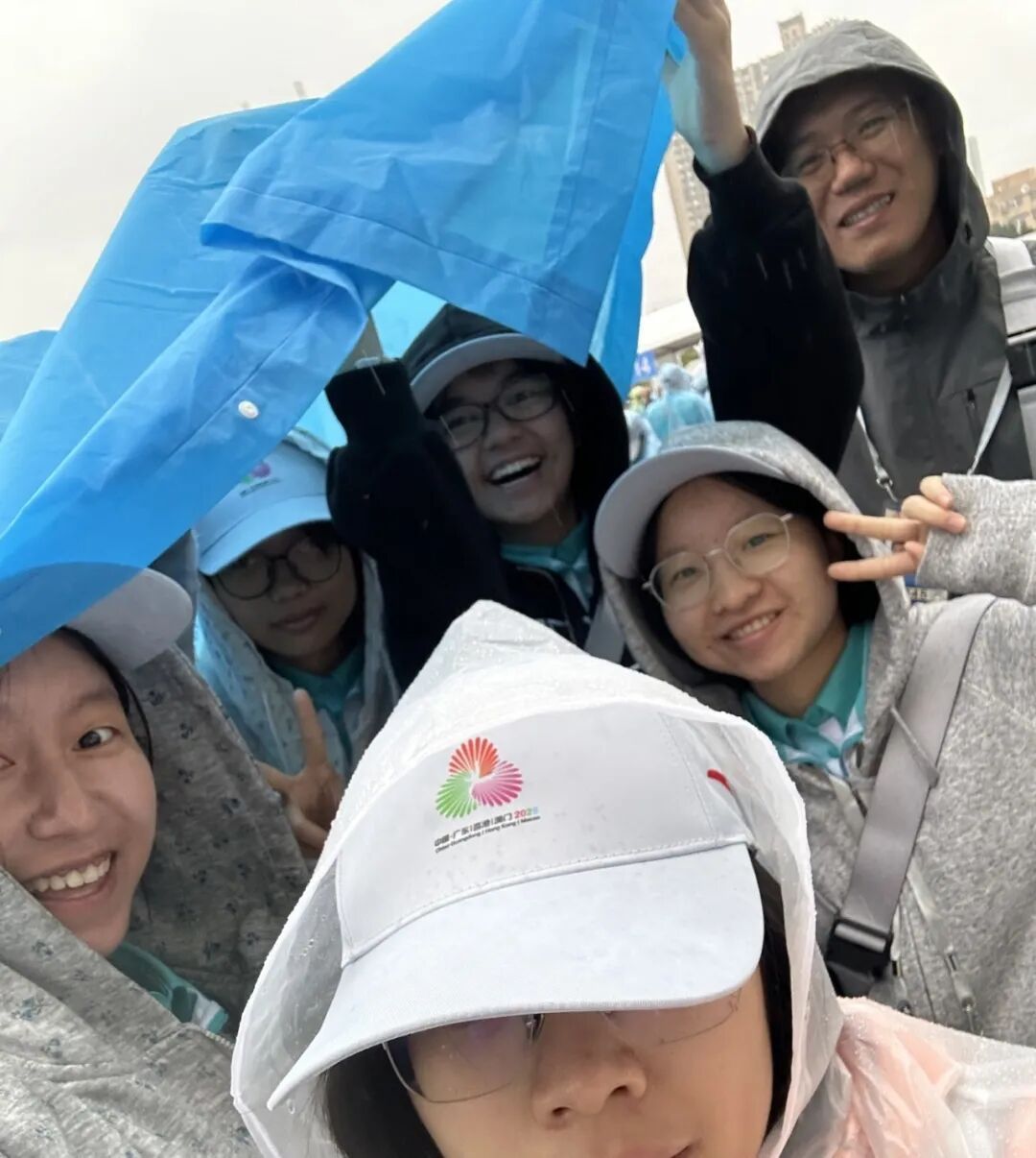 这是我们十五运开幕式志愿者所有培训日子中最冷的一天,那一天早上淅沥沥下着雨,我们刚在远端集结点过完第一次安检。在排队候车的时候,突然间雨变大了,很多小海豚都没有带雨衣,我们东风路校区的带队老师把自己带的蓝色雨衣脱下来,给我们几个小海豚披在身上。热爱记录的我们就把这一幕拍下来了。寒冷的雨和凛冽的风让我们更加团结,更加靠近,在11月的冬天里凝聚起一团温暖的火光,既照亮自己,也照亮世界。