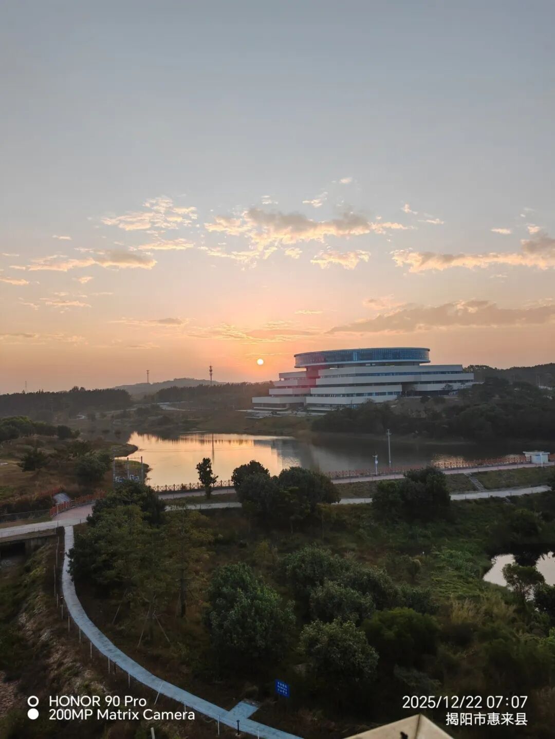 周一凌晨四点醒,半夜带着哽咽,抹干泪水后,拉开床帘,着上正装逃离这个逼仄的空间……除了宿舍门,万籁俱寂,凌晨四点半,空荡的校园,只有自己和这个世界,重新开始看待往日的校园,既熟悉而又陌生,在绝望彻夜的黑暗之后,迎来了天边的一丝灰白,再渐渐地,灰白承接了一半的天空,黑白太极…随着天空逐渐亮起,仿佛从前的黑暗已不存在,回视大地,已万物生辉,红霞渐漫天空,远眺,太阳徐徐升起。