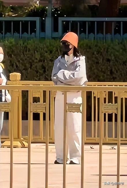 谢娜同样低调接地气,浅灰色外套搭配白色长裤,头戴橙色渔夫帽,脸上遮着黑色口罩。